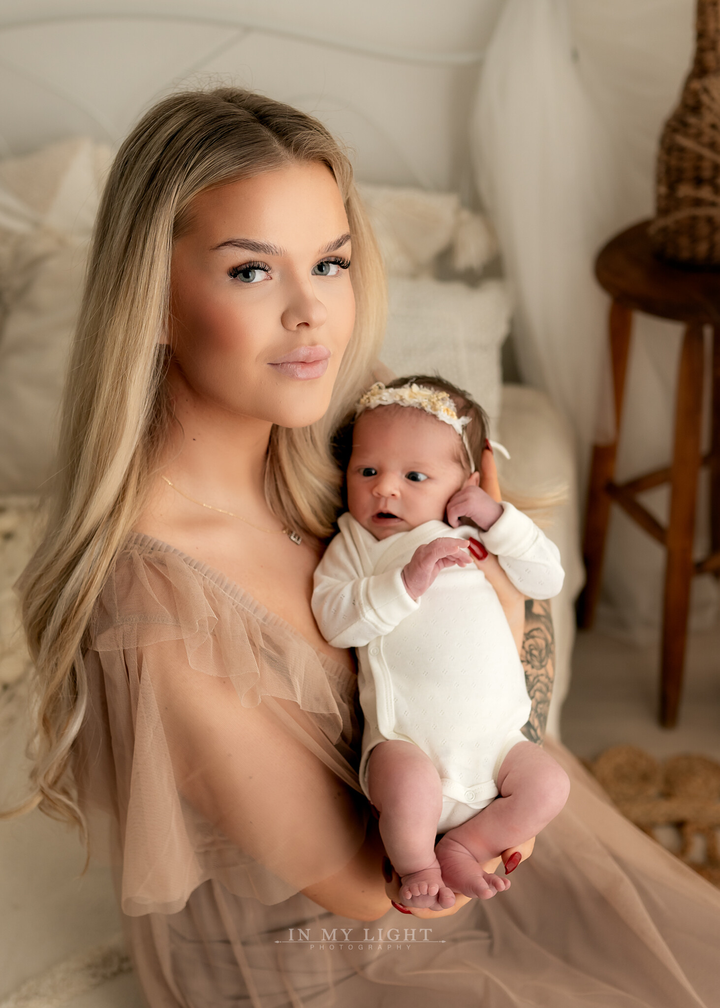 Lette, myke farger: Fargepaletten er ofte pastellfarger, hvite og beige toner, som gir en rolig og fredfull stemning. Dette hjelper med å fokusere på barnet og den naturlige skjønnheten.